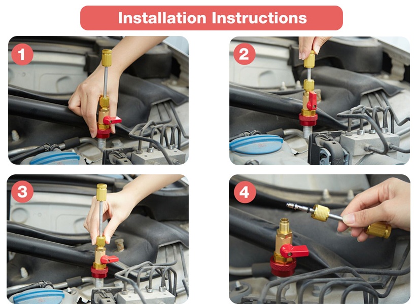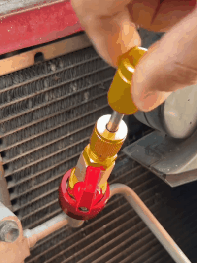 - After tightening the air conditioner, then open the valve on the tool. Push the stem in and rotate the tail knob.